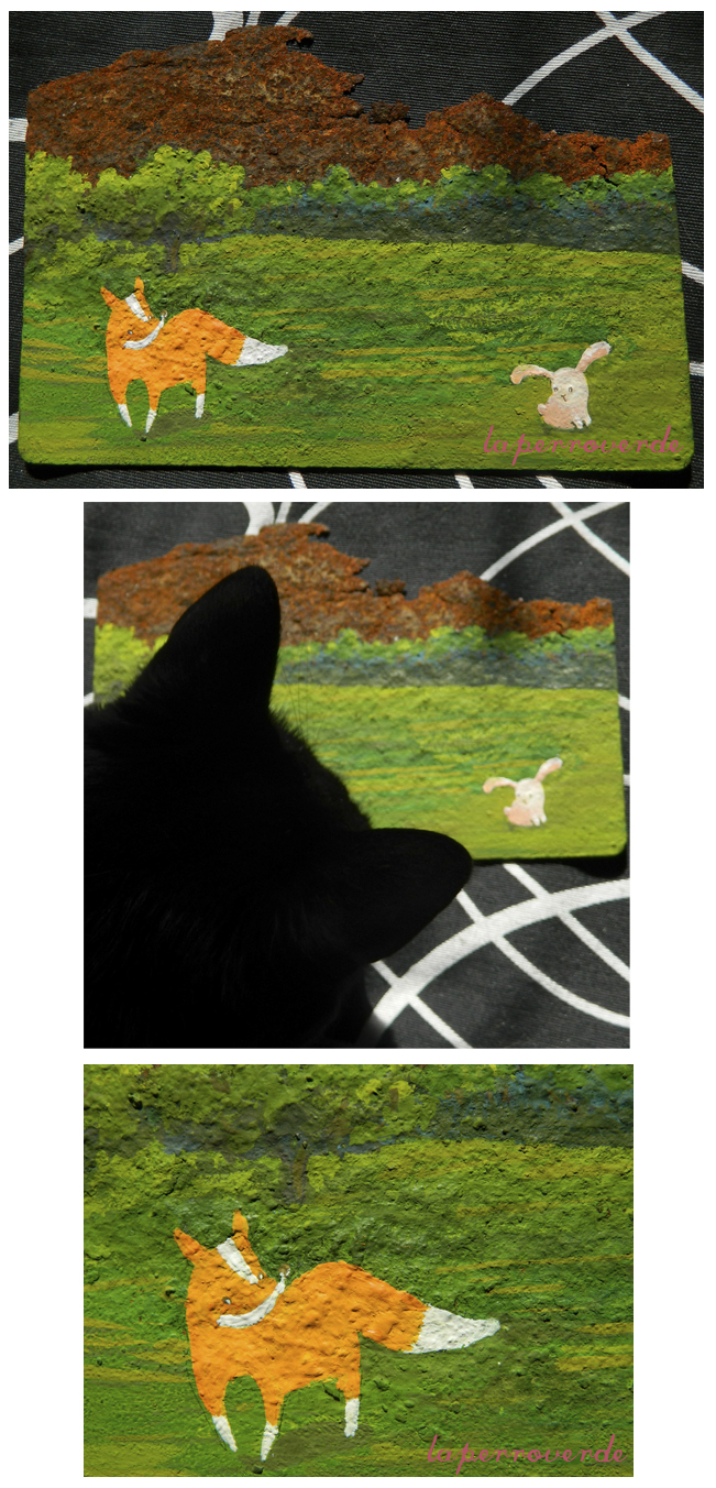 En la calle encontré una plancha metálica oxidada. Era el lienzo ideal para jugar un rato con unas ilustraciones.
