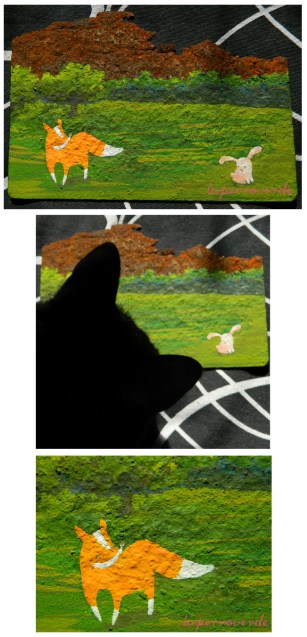 En la segunda imagen podéis ver cómo mira el cuadrito mi gata Miu, a la que le encantan mis dibujos (sobretodo dormir encima del cuaderno o sobre los pinceles en la mesa de dibujo).